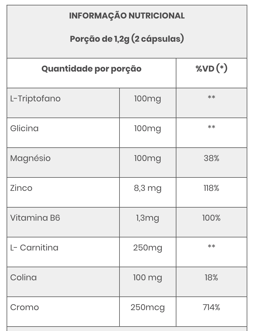 INGREDIENTES: L-Carnitina, L- Triptofano, Glicina, Cártamo em pó, Colina (Bitartarato de Colina), Magnésio (Óxido de Magnésio), Zinco (Bisglicinato de Zinco), Vitamina B6 (Piridoxina), Cromo (Picolinato de Cromo), Antiumectantes Estearato de Magnésio, Talco e Dióxido de Silício. INGREDIENTES DA CÁPSULA: Corantes Dióxido de Titânio, Azul Brilhante e Vermelho 40, Gelatina e Água Potável Filtrada. NÃO CONTÉM GLÚTEN.
